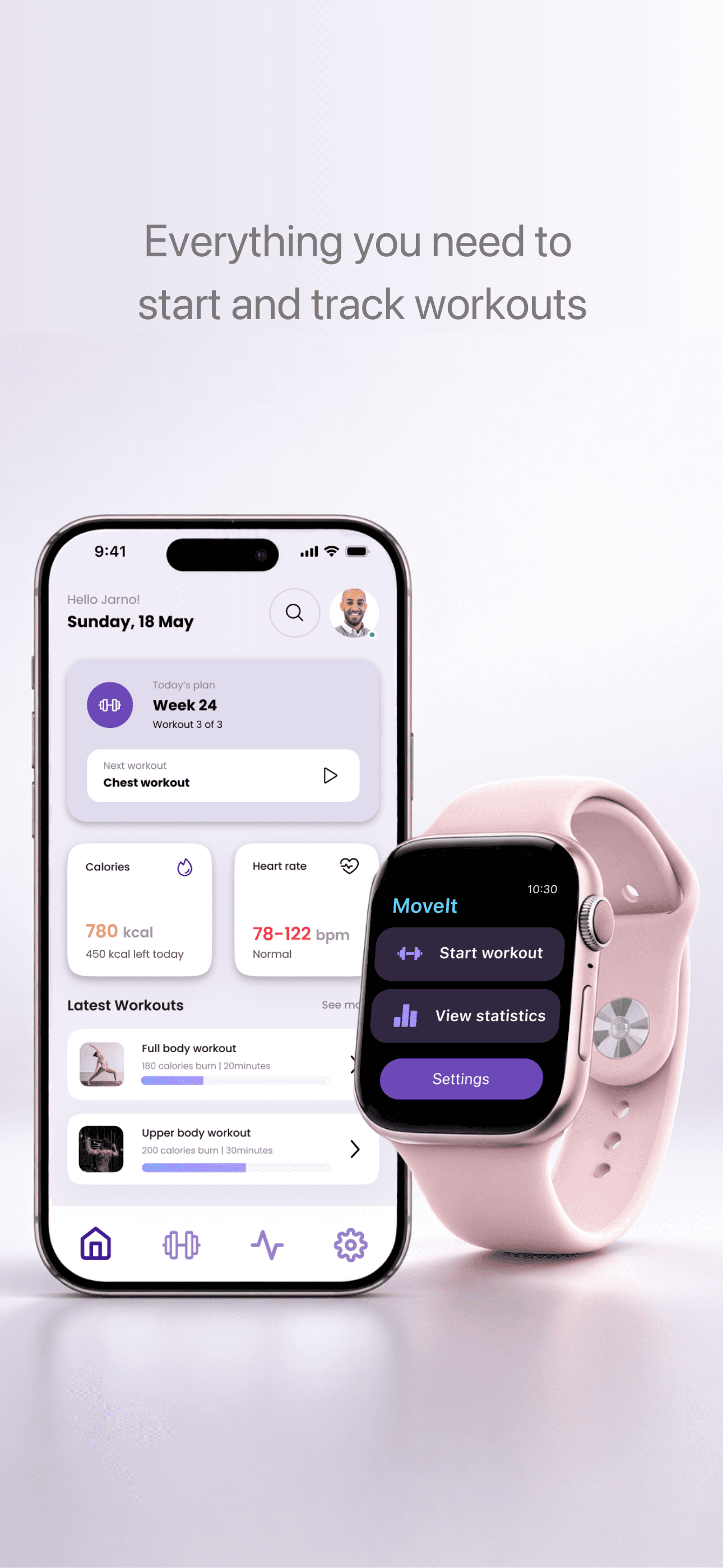 Scenario: Jarno uses MoveIt to complete short workouts at home or while traveling, seamlessly tracking progress between devices.
